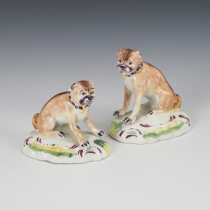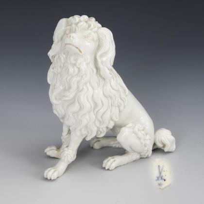 Bologneserhund, Meissen. Blauschwerter mit Schleifstrich unter der Marke, wohl 1. H. 19. Jh. Modell-Nr. 335. Entwurf von Johann Joachim Kaendler. Plastik eines sitzenden, sich kratzenden Hundes. Farbstaffiert. Verso Brandriss am Bein sowie unter den Vorderbeinen je ein kleiner Brandriss. H 18,5 cm.
