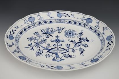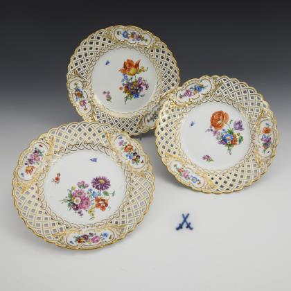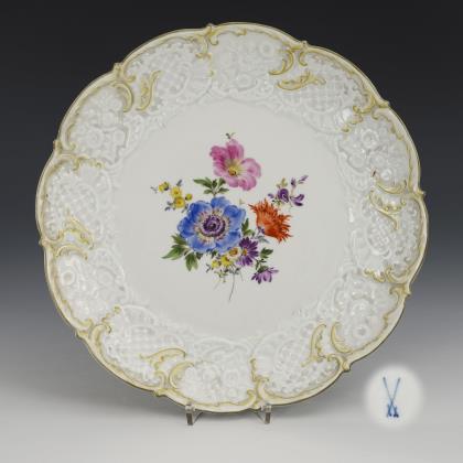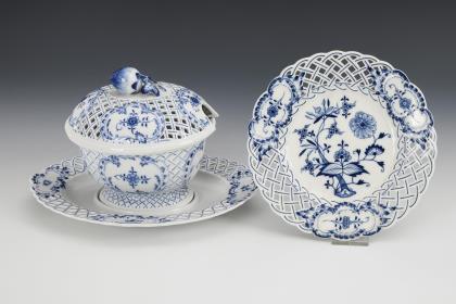 Onion pattern chestnut basket on presentoir and openwork plate. Meissen.