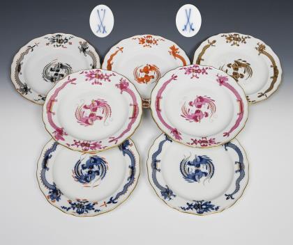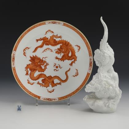 Camaieu-Malerei in Schwarz, gold schattiert, eine Schale gold und eisenrot schattiert, gold staffiert, Dekor "Reicher Drache" und "Mingdrache mit Kante". Pressmarken, Malermarken, Schwertermarken, Platte zweimal gestrichen