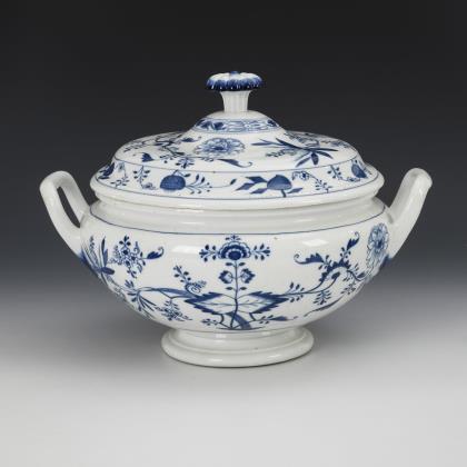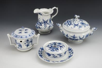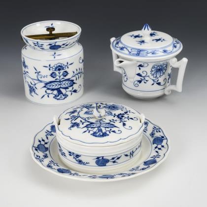 Onion pattern coffee can, butter dish and sauce boat. Meissen.