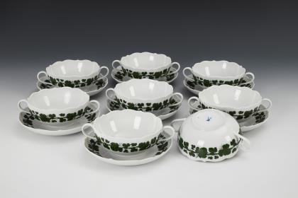 8 soup cups and 7 saucers with vine leaf decoration. Meissen.
