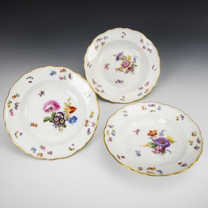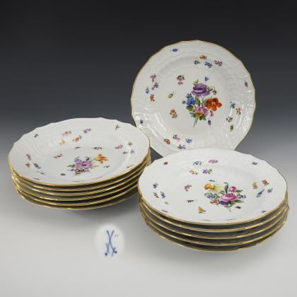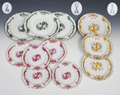 Form "Neuer Ausschnitt", Camaieu-Malerei in Purpur, Grün und Gelb, gold schattiert, drei Teller gold und eisenrot schattiert, gold staffiert. Pressmarken, Schwertermarken, eine Schwertermarke mit Punkt, ein Teller 1950