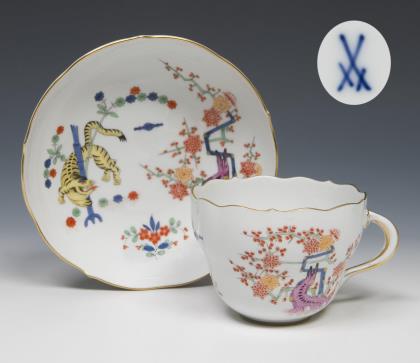 Tasse in Form "Neuer Ausschnitt", Leuchter mit Säulenschaft über quadratischer Plinthe. Kobaltblaue Unterglasurmalerei, farbige Aufglasurmalerei, gold schattiert, gold staffiert, "Tischchendekor". Malermarken, Schwertermarken