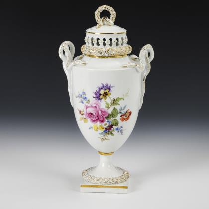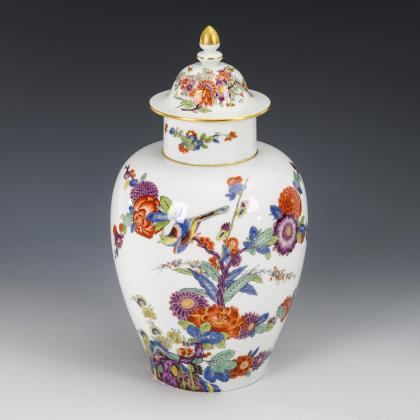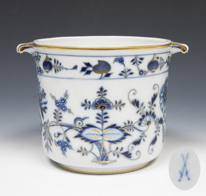 Zylindrischer Korpus mit seitlichen reliefierten Handhaben. Kobaltblaue Unterglasurmalerei, "Zwiebelmusterdekor", gold schattiert, gold staffiert. Pressmarke, Malermarke, Schwertermarke