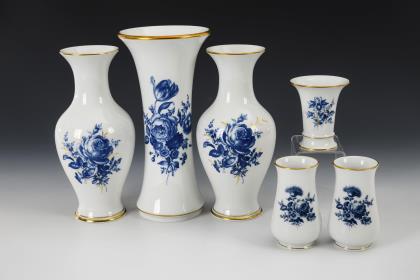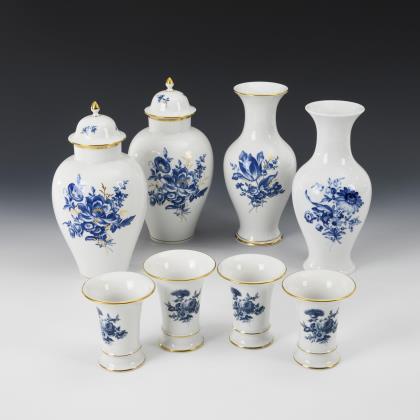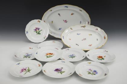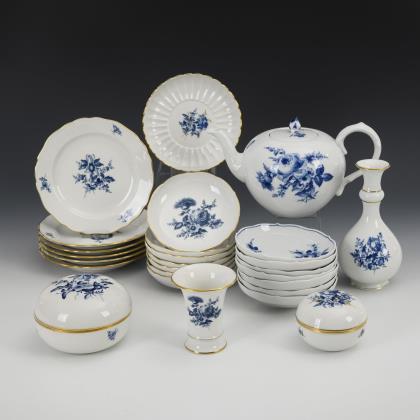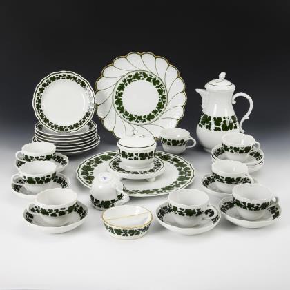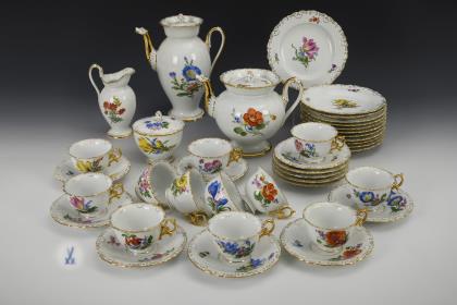 Überwiegend Form "Neuer Ausschnitt". Teekanne (H 14 cm), 2 Dosen (Ø 9 und 12,5 cm), 7 + 7 Untertassen (Ø 13,5 und 14 cm), 6 Kuchenteller (Ø 18 cm), 1 Fächerteller (Ø 16,5 cm), 1 Enghalsvase (H 18,5 cm) und 1 Kratervase (H 9,5 cm)