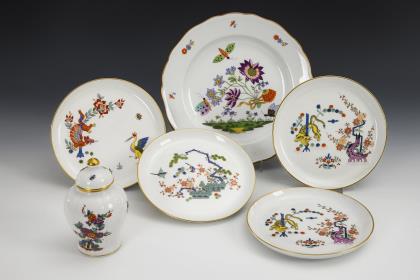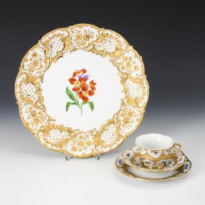 Form "Neuer Ausschnitt", Camaieu-Malerei in Schwarz, Kobaltblau, Eisenrot, Purpur und Braun, gold schattiert, zwei Teller gold und eisenrot schattiert, gold staffiert. Pressmarken, Malermarken, Schwertermarken, zwei Schwertermarken mit Punkt