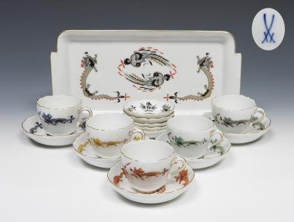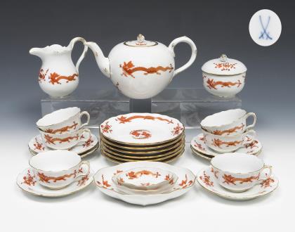 Form "Neuer Ausschnitt", Camaieu-Malerei in Eisenrot, gold schattiert, gold staffiert, "Drachendekor". 22 Teile: Teekanne, Milchkännchen, Zuckerdose, Kuchenschale, 6 Teetassen, 6 Untertassen, 6 Dessertteller. Pressmarken, Malermarken, Schwertermarken, eine Tasse dreimal gestrichen