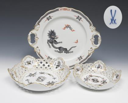 Handle plate, 2 openwork bowls with dragon decoration. Meissen.