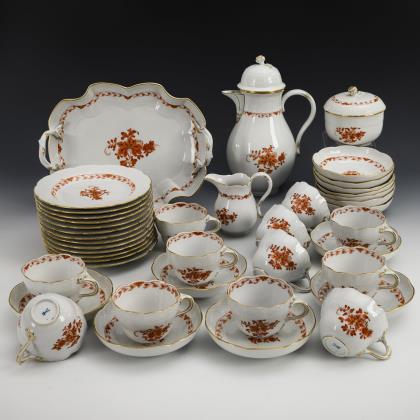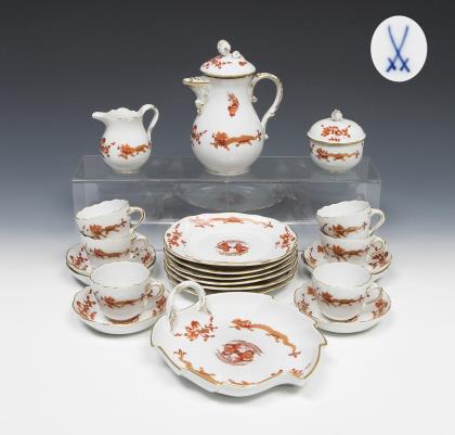 Form "Neuer Ausschnitt", Camaieu-Malerei in Eisenrot, gold schattiert, gold staffiert, "Drachendekor". 24 Teile: Teekanne, Milchkännchen, Zuckerdose, 3 ovale Konfekt-Gebäckschalen, 6 Teetassen, 6 Untertassen, 6 Dessertteller. Pressmarken, Malermarken, Schwertermarken