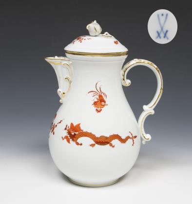 Form "Neuer Ausschnitt", Camaieu-Malerei in Eisenrot, gold schattiert, gold staffiert, "Drachendekor". 22 Teile: Mokkakanne, Milchkännchen, Zuckerdose, Gebäckschale in Blattform, 6 Mokkatassen, 6 Untertassen, 6 Dessertteller. Pressmarken, Malermarken, Schwertermarken, Dessertteller 1935-1947, viermal gestrichen