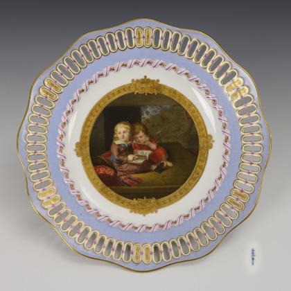Zwei blondgelockte Mädchen halten das gerahmte und bekrönte Profilbildnis vermutlich ihrer Mutter. Die Orange ist ein Symbol für Fruchtbarkeit und Lebensfreude, der Pfau gilt als Symbol für Herrschertum und Schönheit. Vergoldeter Stuckrahmen