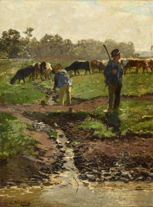 MÜHLIG, Hugo (1854 Dresden - 1929 Düsseldorf). Shepherds and grazing cattle at the water.
