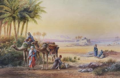 GOODALL, Frederick (1822 London - 1904 London). Bedouins and camels in an oasis.
