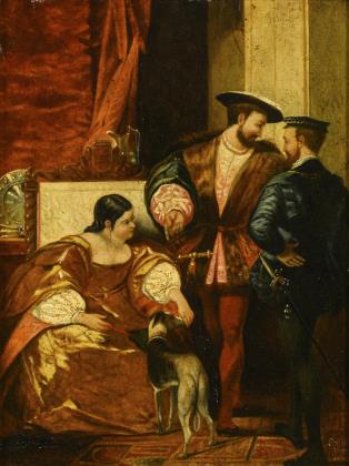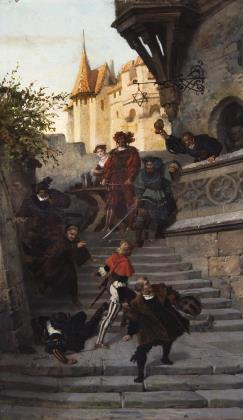 Eine für das 19. Jahrhundert typische Mischung aus Historie und Genre. Die vielfigurige Szenerie wurde vermutlich von einem Schüler von Carl Theodor von Piloty (1824-1886) gemalt. Neuwertiger profilierter Goldrahmen