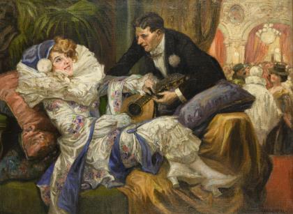 GEIGER, Richard (1870/72 Vienna - 1945 Budapest). Galant ball scene with gentleman and columbine.