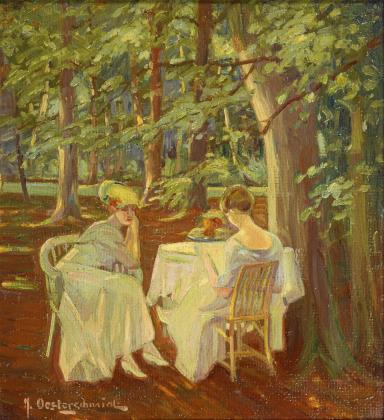 OESTERSCHMIDT, J.. Art Nouveau park landscape with women.