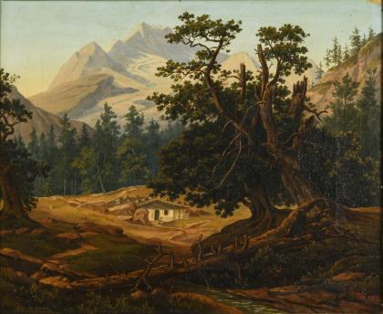 BRUNS, C. G. (1811 - 1884). Romantic mountain landscape with a view of two towns.