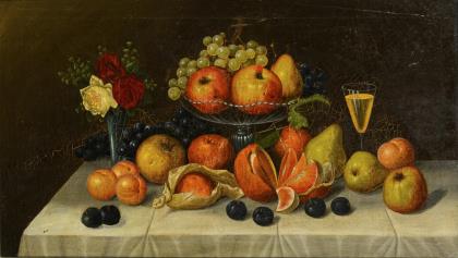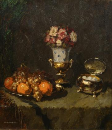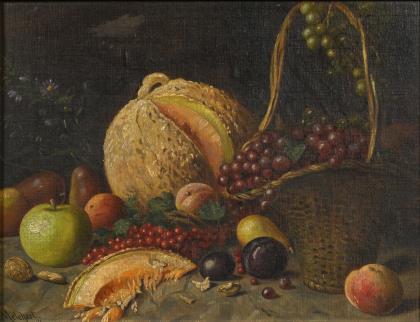 DEMONT, Adrien (1851 Douai - 1928 Wissant). Still life with fruit and wine balloon.
