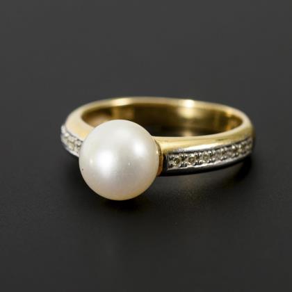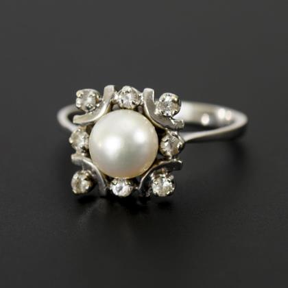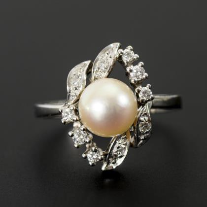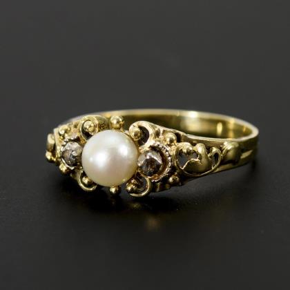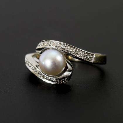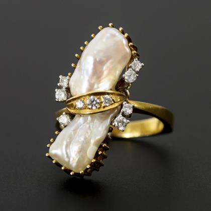 Unusual ring with small brilliant-cut diamonds and a baroque pearl.