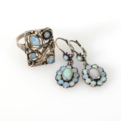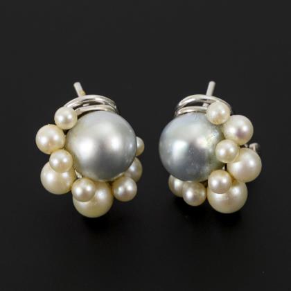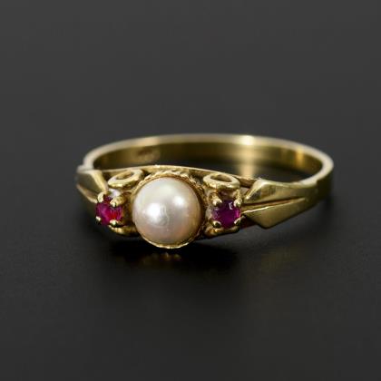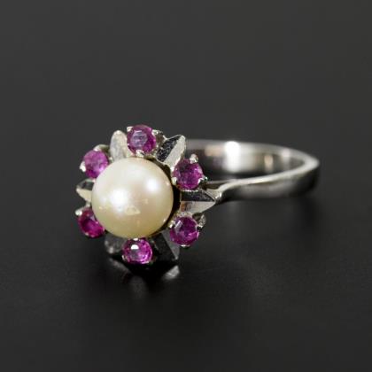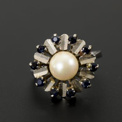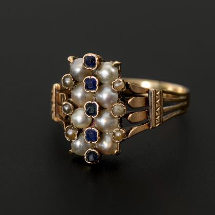 Ring set with halved pearls, halved seed pearls and blue colored stones.