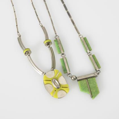 Mehrreihiges Kunststofffadencollier mit 3 auswechselbaren Verschlusselementen, 2 davon mit Marke Jörg Heinz gestempelt: ein Kugelverschluss mit Rutilquarznadeln, eine facettiert geschliffene Kugel, wohl Blauachat, sowie ein naturalistisch geformtes Element mit Opalader
