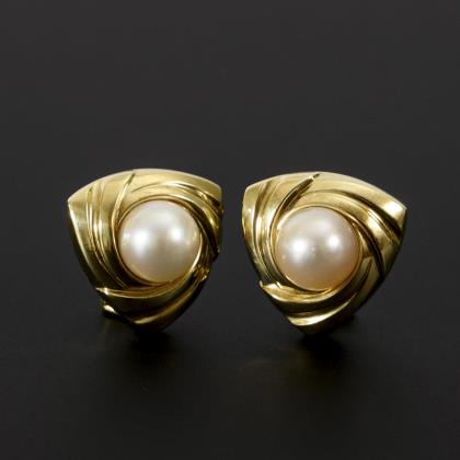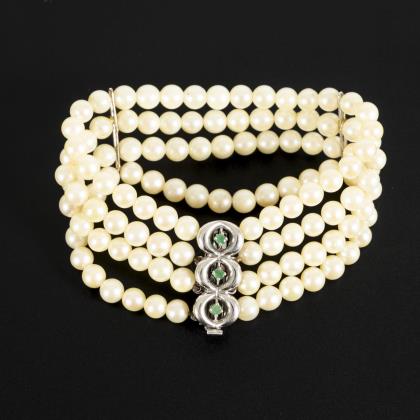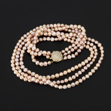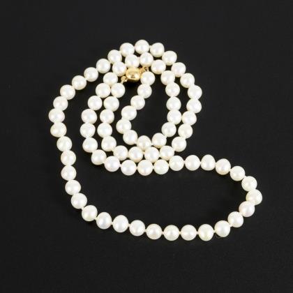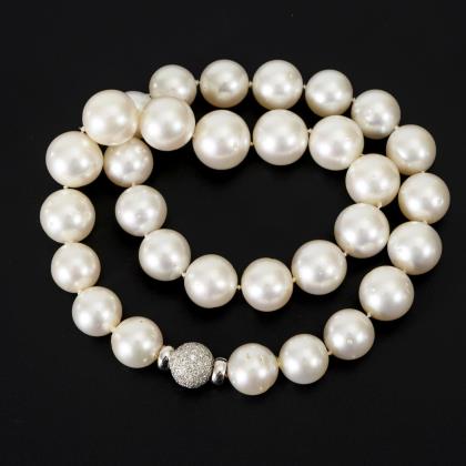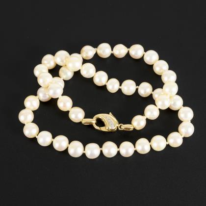 Einzeln geknotete Perlenkette mit großer Schließe in Gelbgold, diese beidseitig mit kleinen Brillanten besetzt