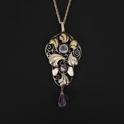 Exceptional Theodor FAHRNER pendant with amethysts and half pearls, on a chain.