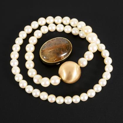 Eine Perlenkette mit zwei auswechselbaren Drehverschluss-Elementen; eines eine Kugel der Marke Jörg Heinz (gestempelt) in Gelbgold, sowie ein zweites in Silber vergoldet mit großem Rutilquarznadel-Cabochon