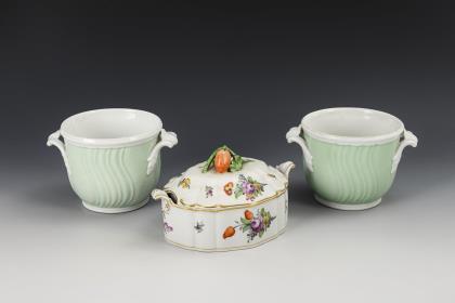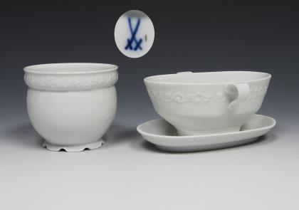 Sauciere: Modell von Paul Börner 1927, Cachepot: Modell von Hermann Zeillinger 1925. Weißporzellan mit floralen Reliefbordüren. Pressmarken, Schwertermarken einmal und viermal gestrichen, Cachepot 1992