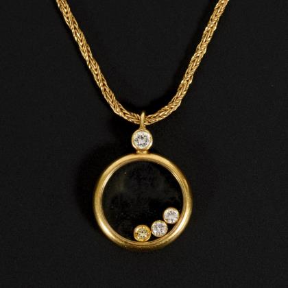 Collier aus einer gedrehten Kordelkette mit rundem, verglasten Anhänger aus der Designreihe "Happy Diamonds". In der Verglasung 3 Brillanten, einer davon in einem gelben Farbton. Ein etwas größerer, zargengefasster Brillant an der Anhängeröse