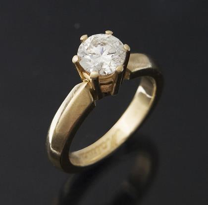 Brillant in Krappenfassung 1,01 ct, Reinheit P 1, Farbe Weiß H, Schliff sehr gut, Proportionen sehr gut, Fluoreszenz leicht. Stabile volle Schiene, Punzen: Gold-Feingehalt, Brillant-Karat, Idar-Oberstein-Nr. G1 013692, Namenszug Maiwand, Juweliermarke