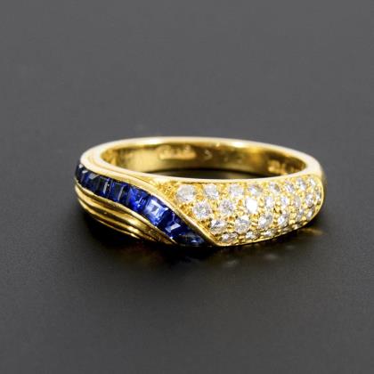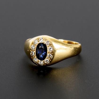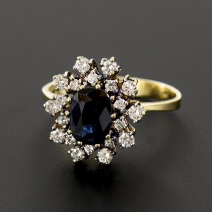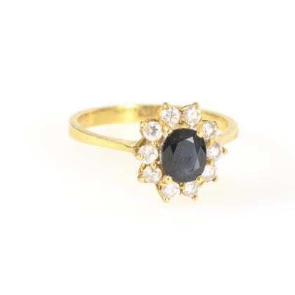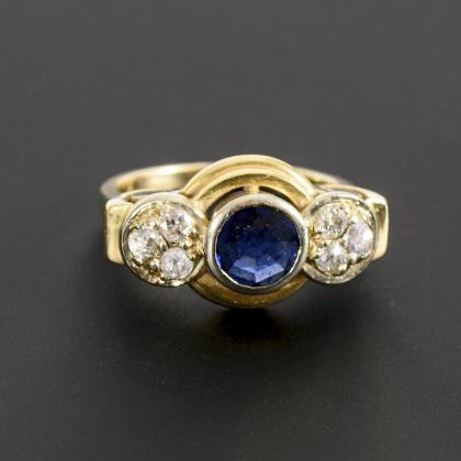 Ring with blue colored stone, probably sapphire, and diamonds.