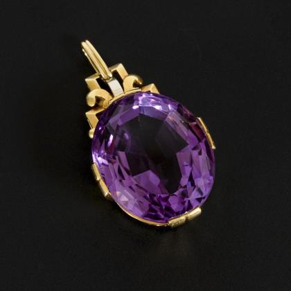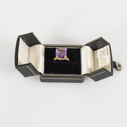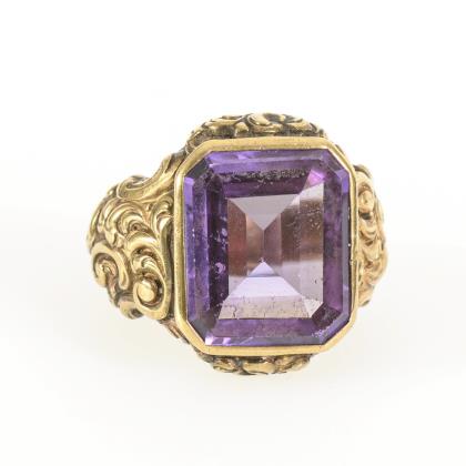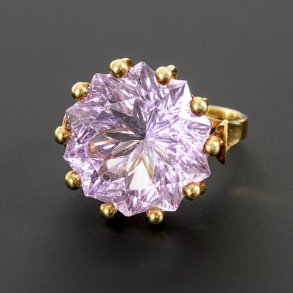 Ring with a fantasy-cut lilac-colored stone, probably amethyst.