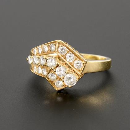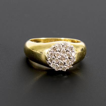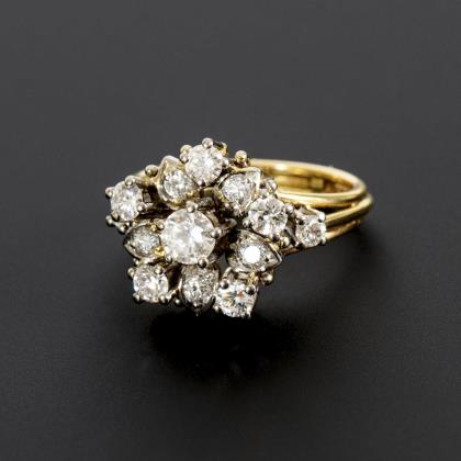 Ring mit üppigem Brillant-Besatz in Blütenform. die Schiene in Gelb-, die Fassungen der Brillanten in Weißgold gearbeitet