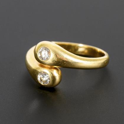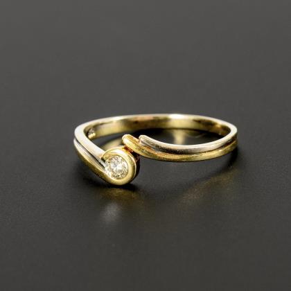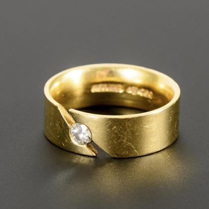 Brillantsolitär in ungewöhnlich gestalteter, zu einer Seite leicht geöffneter Zargenfassung in einem assymetrisch gestalteten Ringkopf