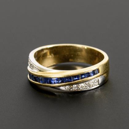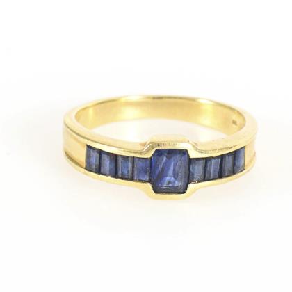 Dainty ring with dark blue colored stones or syntheses and light-colored imitations.