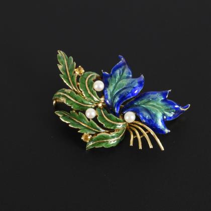 Enameled vintage brooch with leaf elements.