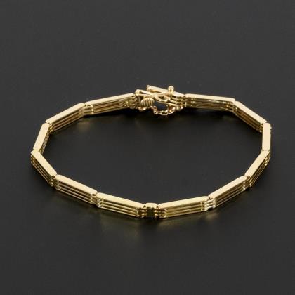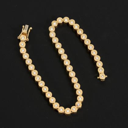 Zwischen einer breiten Schiene in Gelbgold ein runder Ringkopf in Weißgold, dieser mit 25 Brillanten in 3 konzentrischen Kreisen angeordnet. Leicht terrassenförmig gestufter Aufbau
