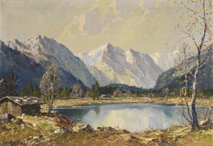 MÜLLER-SCHWABEN, Fritz ( 1879 Mainz - 1957 München) Alpensee Öl/Leinwand. Rechts unten signiert. 63 x 53 cm. Blick vom seichten Ufer hinüber zu der Hütte im Sonnenschein am Fuß der Berge Maler der Münchner Schule.