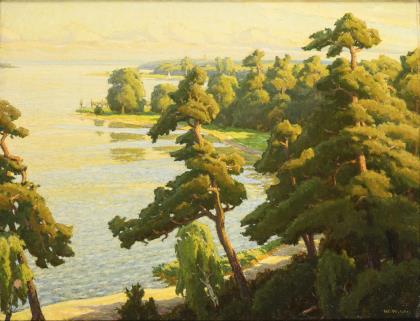 WILCKE, Wilhelm (1885 Templin - 1979 Cologne). Märkische lake landscape with Grunewald tower.