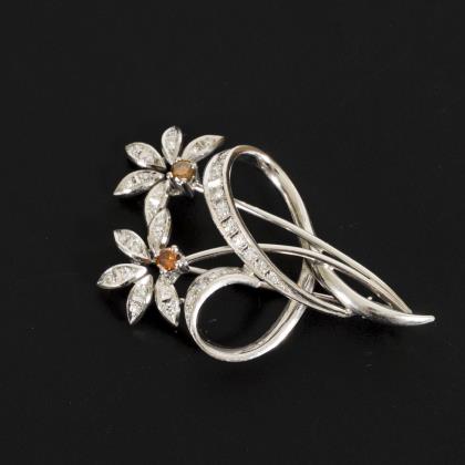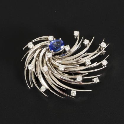 Dynamisch gestaltete Brosche ausgefasst mit einem kornblumenblauen Farbstein, wohl Saphir, und 16 Brillanten. Rückseitig mit Kugelhakenverschluss
