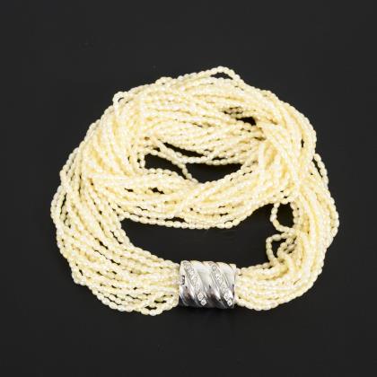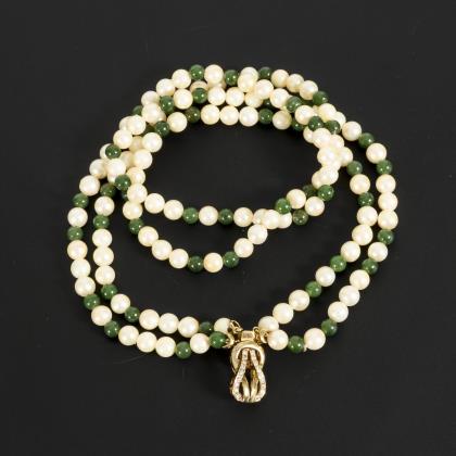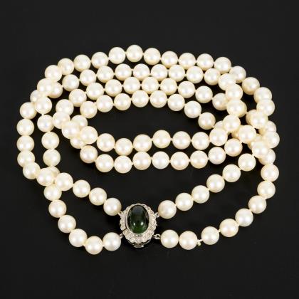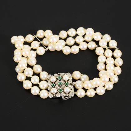 Dreireihiges Perlenarmband mit einemgroßen Zierschloss in floraler Ausgestaltung, dieses zusätzlich mit 4 kleineren Perlen und 5 grünen Farbsteinen, wohl Smaragden, besetzt. Das Schloss mit doppelten Achtersicherungen