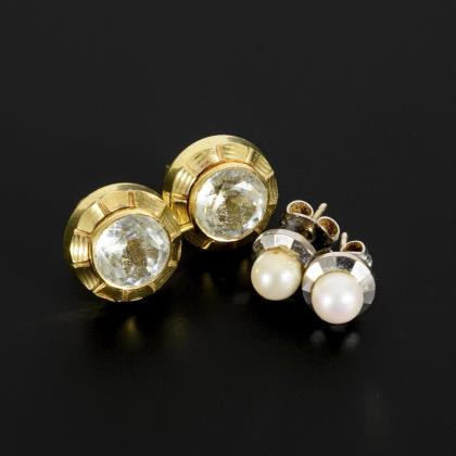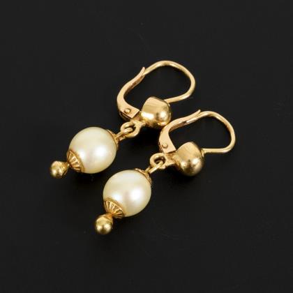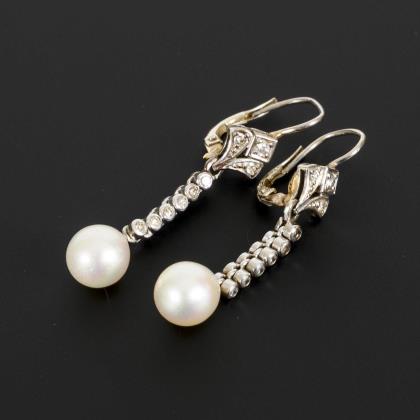 Elegante Ohrhänger mit langen Abhängungen bestehend aus zargengefassten Achtkant-Diamanten mit je einer Perle in Weißgold. Rückseiten, Ohrbügel und Brisur in Gelbgold gearbeitet