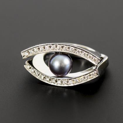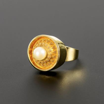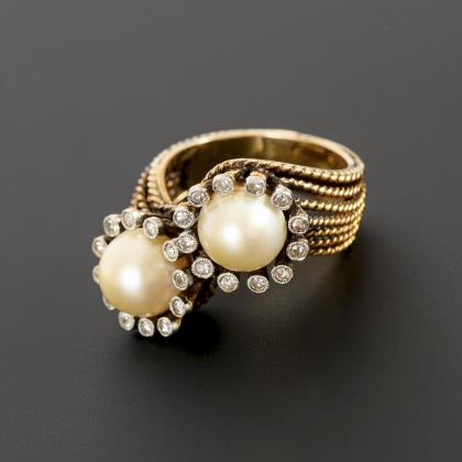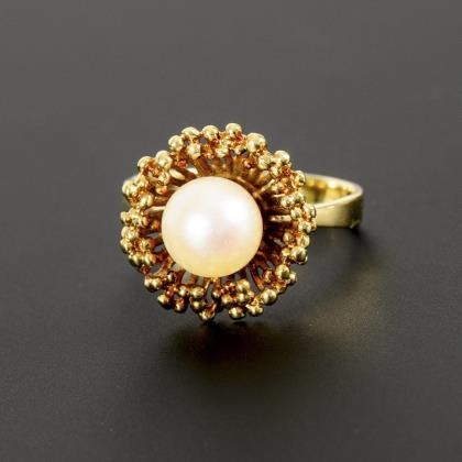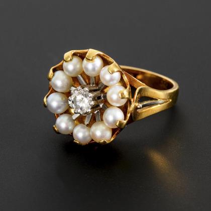 Ring in Gelbgold mit rundem Ringkopf, darin ein in Weißgold gefasster Brillant umgeben von 10 Zuchtperlen, die Ringschultern gebrochen gearbeitet mit Zierelement in Weißgold