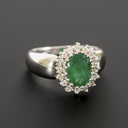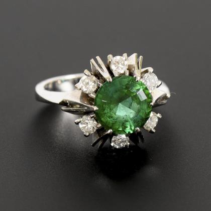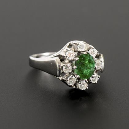 Vintage cocktail ring with large, green colored stone, probably emerald, and diamonds.