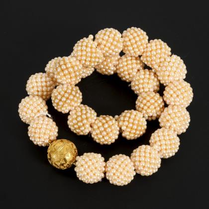25 große Süßwasserperlen umgeben von handgewebten Perlennetzen (an den Rändern teils gelöst), mit Goldkugel-Schließe (18 kt, 7 g)