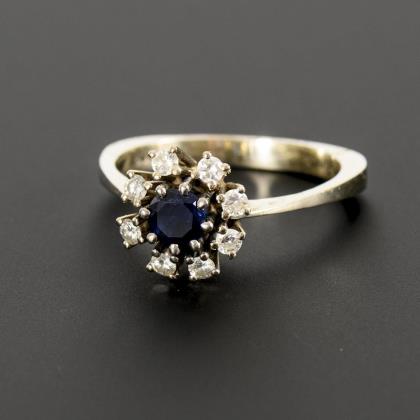 Vintage Daisy-Ring mit einem zentralen Saphir, umgeben von 8 Brillanten