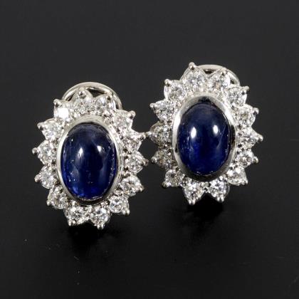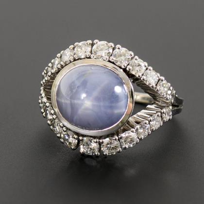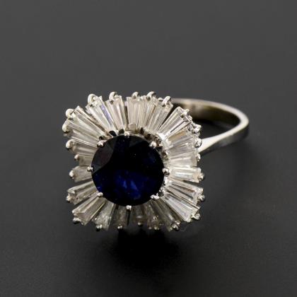 Großer, rundfacettierter blauer Farbstein, wohl Saphir, in Krappenfassung, umgeben von 24 wellenartig angeordneten Diamanten im Baguetteschliff auf einer schmalen Schiene