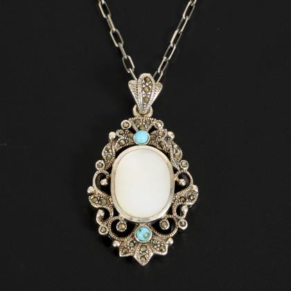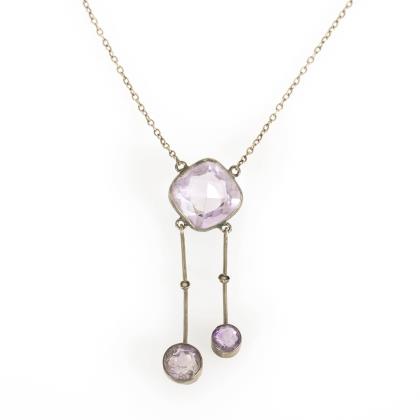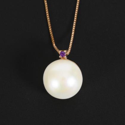 An einer zarten Venezianerkette ein Anhänger mit einer großen, nach hinten abgeflachten Perle, an der Öse mit einem kleinen, krappengefassten Amethysten verziert
