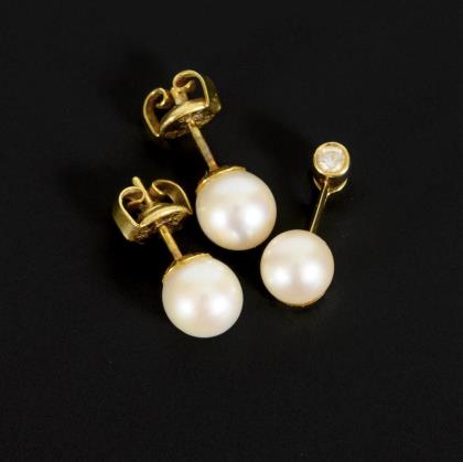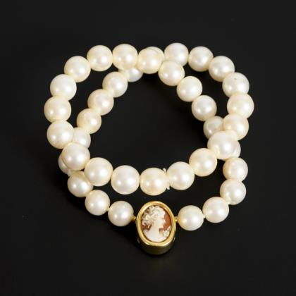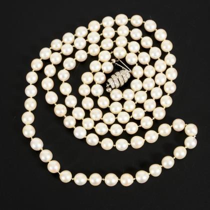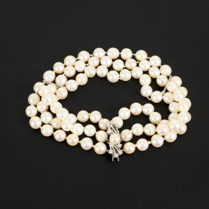 Einzeln geknotete Perlenkette mit großer Schließe in Gelbgold, diese beidseitig mit kleinen Brillanten besetzt